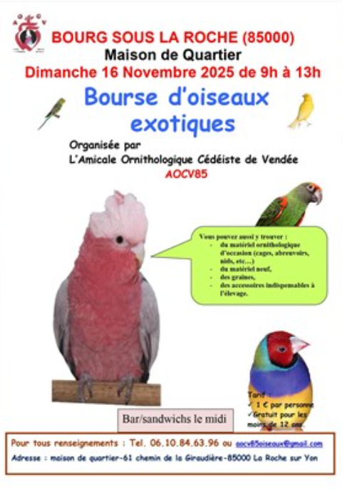 L’Amicale Ornithologique Cédéiste de Vendée 85 organise une foire aux oiseaux exotiques de cages et de volières le dimanche 16 novembre 2025 de 9 h à 13 h.