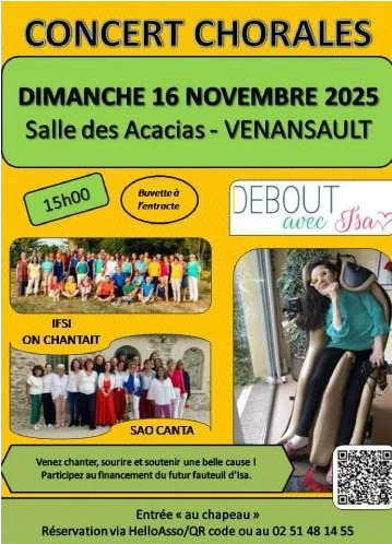 Venez assister au Concert Chorales d'Ifsi on chantait et Sao Canta au profit de l'Association DEBOUT AVEC ISA. Entrée "au chapeau". Vous contribuerez au financement du futur fauteuil d'Isa.