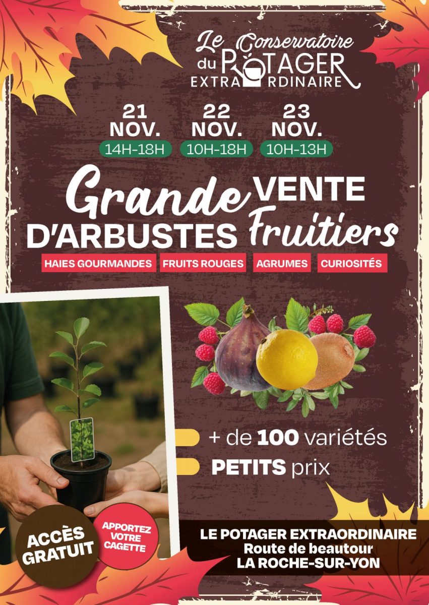Le Conservatoire du Potager Extraordinaire propose une grande vente d'arbustes fruitiers les 21, 22 et 23 novembre 2025. Haies gourmandes, fruits rouges, agrumes, curiosités… Découvrez plus de 100 variétés à petits prix.