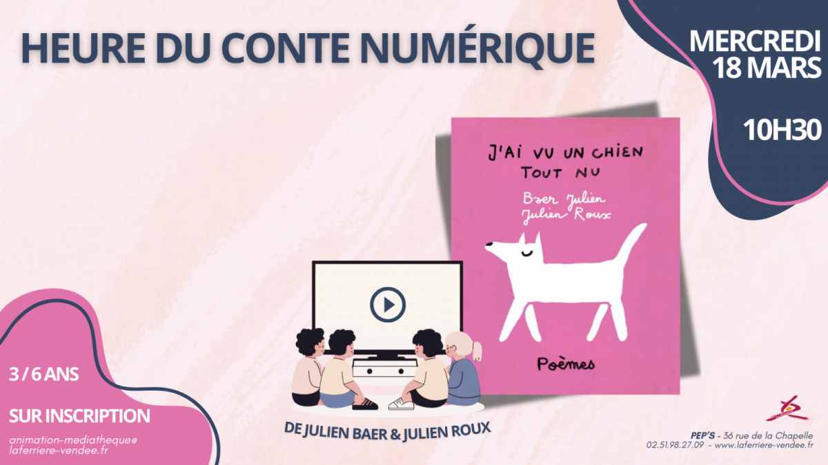 Au programme : Plongez dans une histoire en version numérique "J'ai vu un chien tout nu", de Julien Baer et Julien Roux. Sur inscription à animation-mediatheque@laferriere-vendee.fr. De 3 à 6 ans.