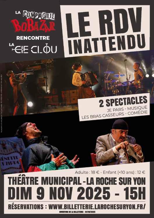 Imaginez : deux compagnies vendéennes, BOBAZAR et CLOU, s'unissent pour vous offrir un double programme ! D'un côté, l'univers poétique et surprenant du spectacle musical de BOBAZAR, et de l'autre, l'humour décapant et original de la comédie signée CLOU.