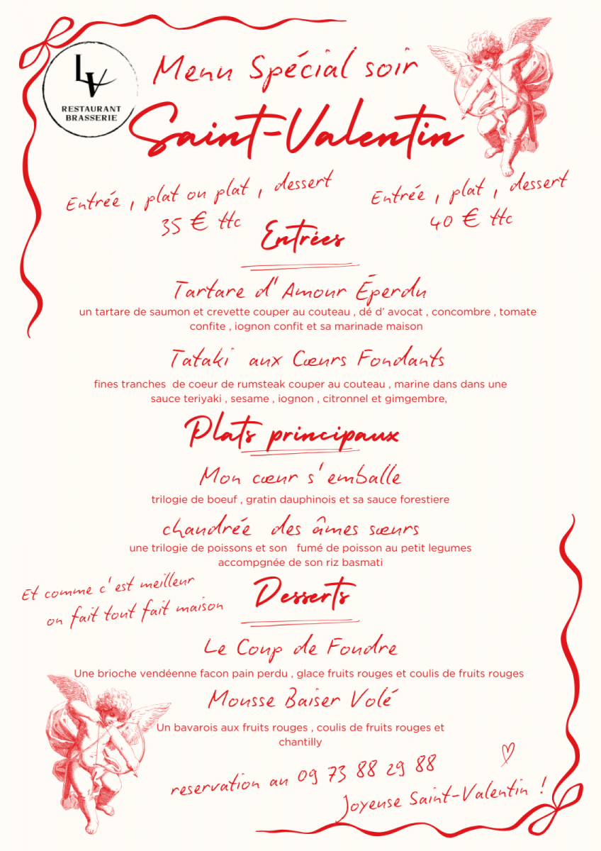 Nous proposons un menu spécialement élaboré pour cette soirée. Seul le menu sera proposé, pensez à réserver votre table au 09 73 88 29 88 ou pas mail a lincontournablevendeen@free.fr.