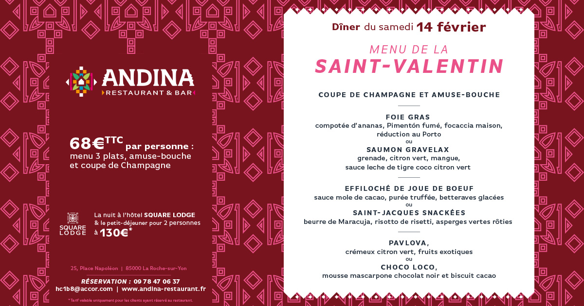 Menu Saint-Valentin 2026 chez Andina à La Roche-sur-Yon