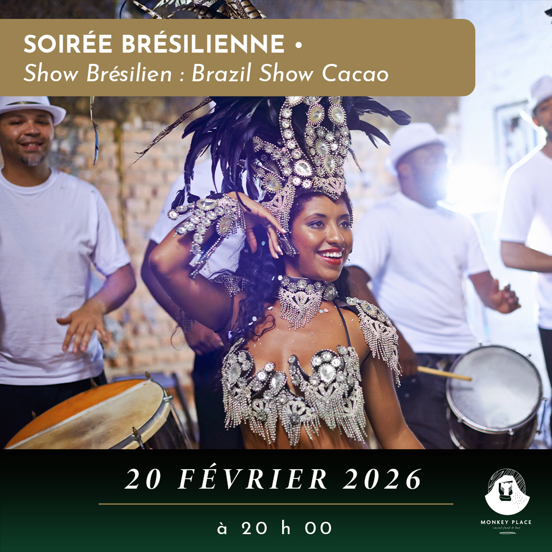 Brazil Show Cacao vous embarque au cœur du Brésil avec un spectacle vibrant mêlant rythmes brésiliens, énergie festive et ambiance solaire. Un moment chaleureux et immersif à vivre au Monkey Place.