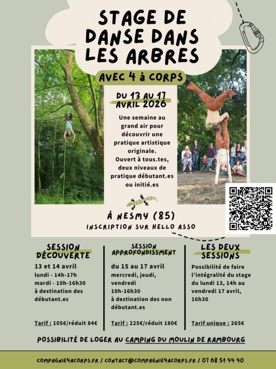 La compagnie 4 à Corps propose des ateliers de pratique de la danse pour petits et grands. Venez vous initier à la danse dans les arbres.