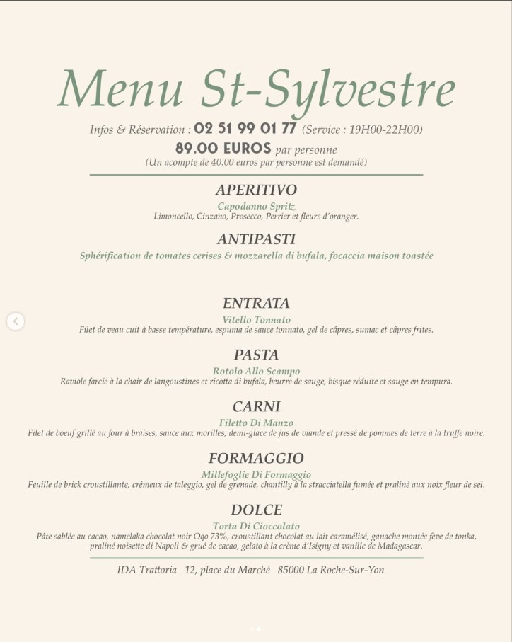 Office de tourisme Les Animaux de la Place Trattoria Ida – Menu de la Saint Sylvestre
