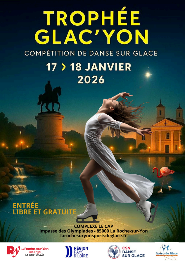 Les 17 et 18 Janvier 2026 se déroule au Patinoire du Complexe Le Cap la Trophée Glac'Yon organisée par La Roche Sur Yon Sports de Glace, le club de patinage artistique, freestyle et danse sur glace de La Roche sur Yon. Cette compétition fait partie du Tournoi Inter-Régional de Danse sur Glace 2025-2026 sous l'égide de la FFSG Commission Sportive National de Danse sur Glace.