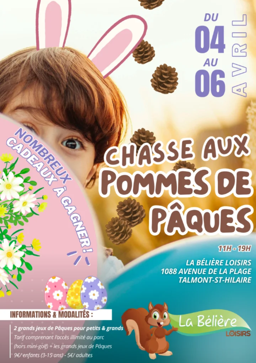 Pendant Pâques à la Bélière Loisirs, les enfants et les familles pourront participer à la chasse aux pommes de Pâques et tenter de remporter de nombreux cadeaux. Des récompenses chocolatées seront aussi au rendez-vous, ainsi que des lots comme des entrées dans d’autres parcs.