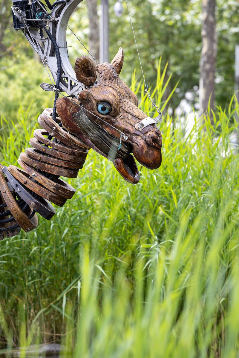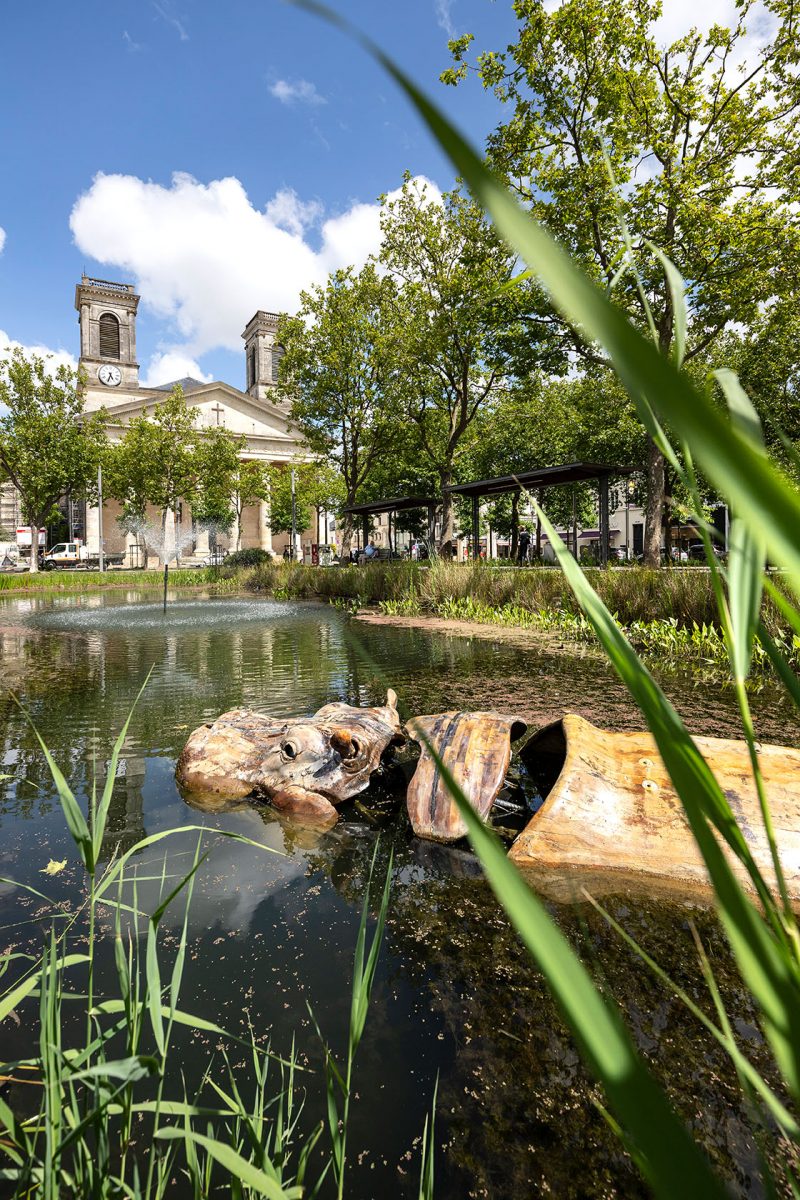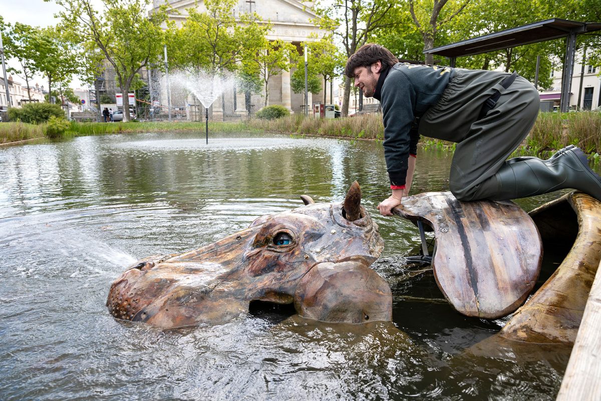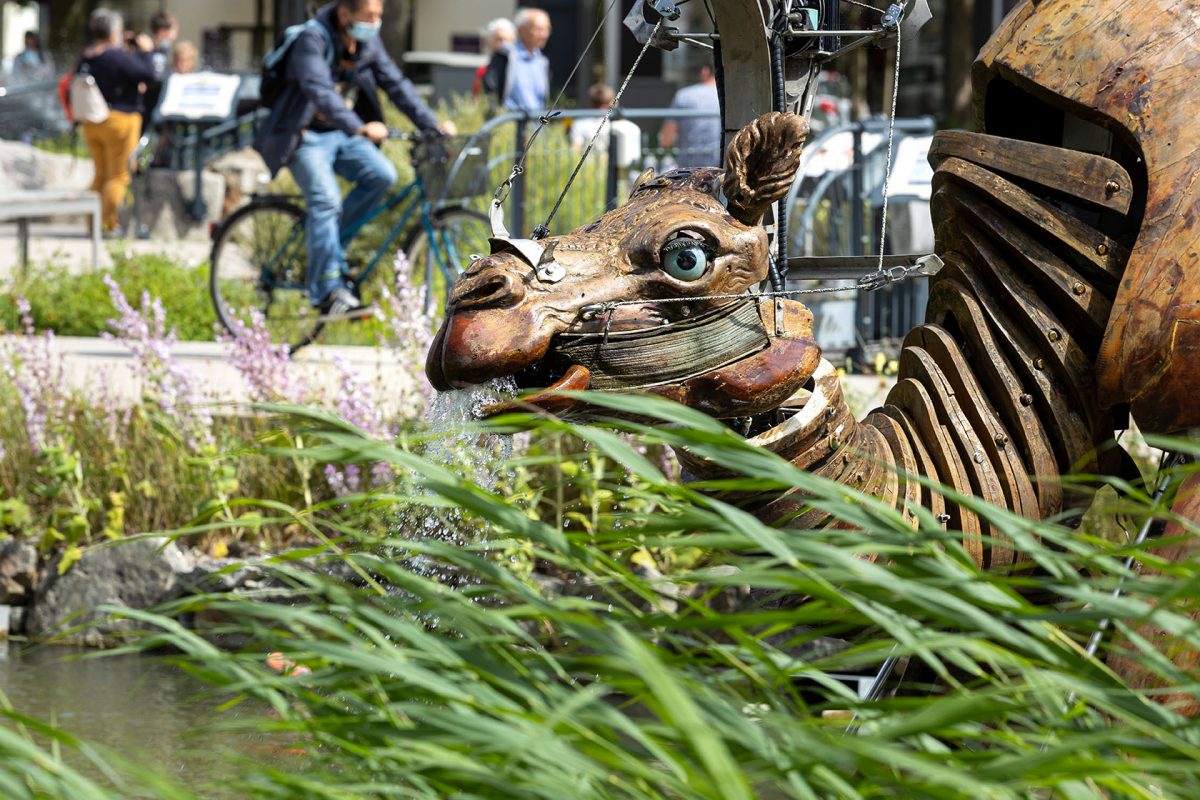 C’est un matin d’hiver 2013, dans le quartier des Forges, que ce géant herbivore qui passe ses journées dans l’eau a été découvert. Il est construit à partir de trois matériaux différents. Faites-le sortir de l’eau, ouvrir la gueule et… cracher sur les passants !