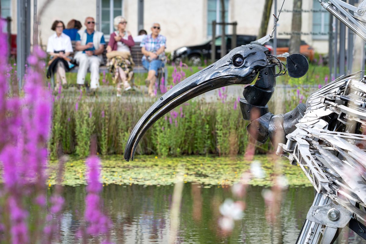 C’est à l’emplacement de l’actuel office de tourisme qu’a été découvert cet imposant échassier d’une hauteur de 2,40m ! Recouvert d’un acier inoxydable sur 80% du corps, il ouvre son bec, lève et baisse sa tête ainsi que ses pattes, et déploie ses larges ailes. L’envergure de celles-ci atteint 6m !